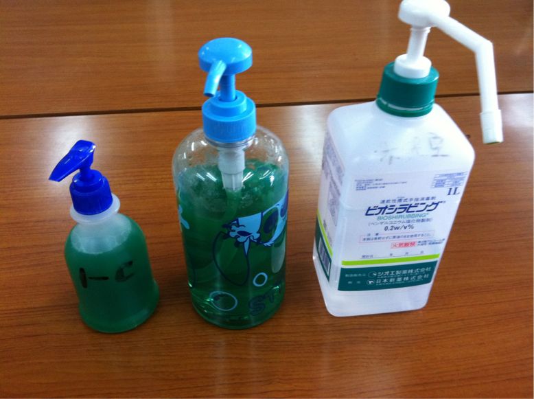 各教室には、手洗い用の液体石けんと消毒用アルコール。
