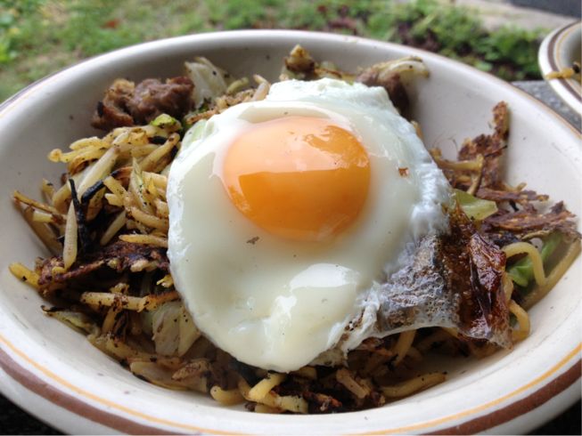 蒜山の地鶏、特製ソース、キャベツに半熟卵が絡み…そこにみんなで作った思い出が詰まった世界に1つしかない焼きそばは絶品です!!