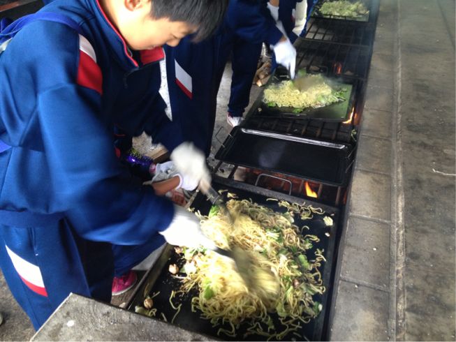 各クラス、11時20分頃から蒜山焼きそば作りが始まりました。