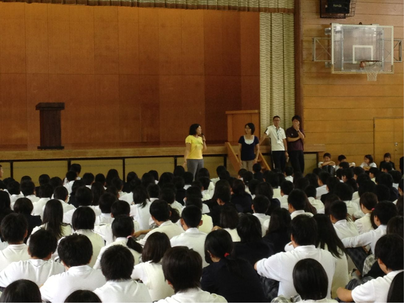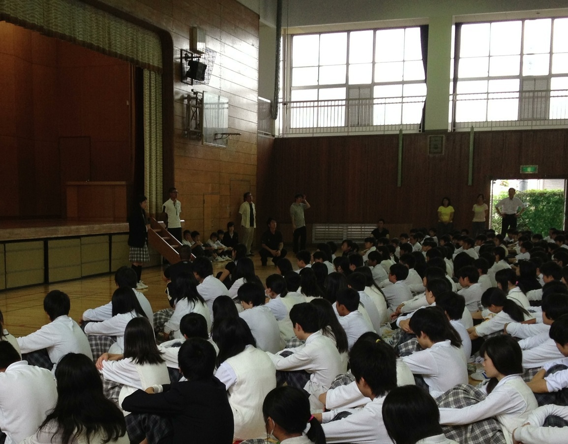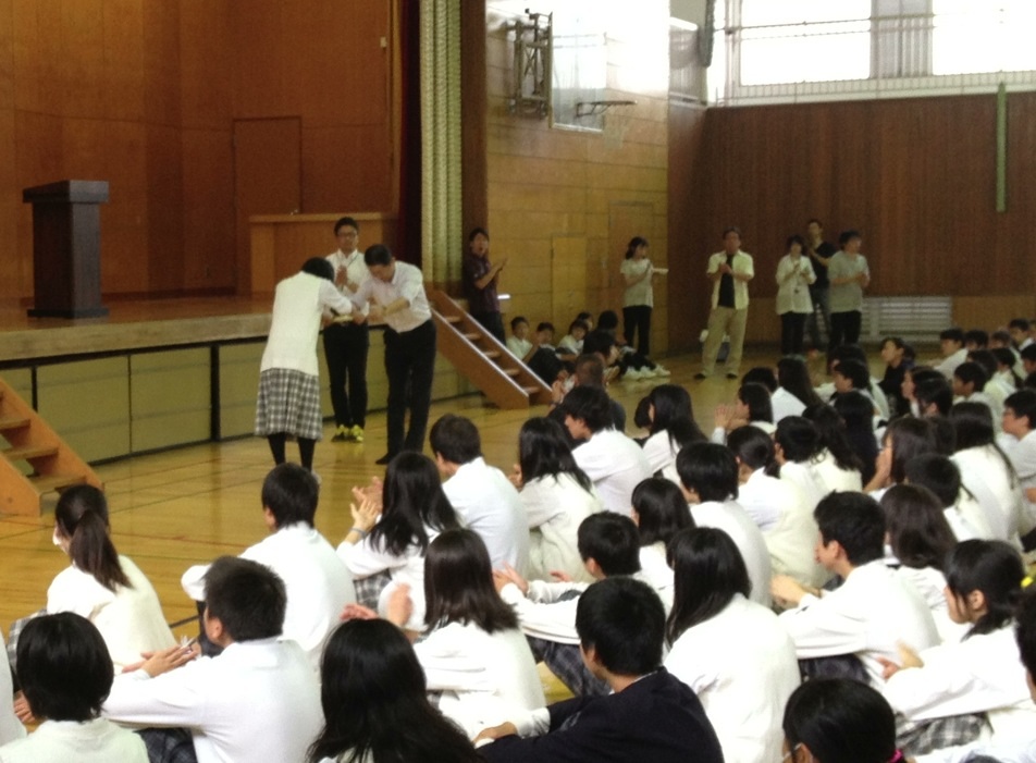 最後は、新しく赴任されたALTのエミリンさんの紹介と、生徒指導主事の勝谷先生から、宿泊学習を終えた各学年の成長についての話がありました。