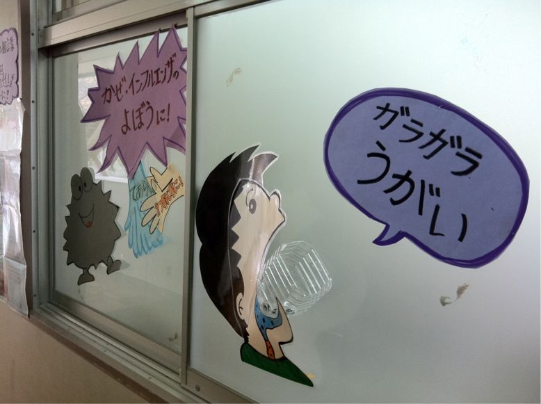 保健室の窓に、こんな掲示物がありました。ペットボトルをコップにみたてガラガラうがいを励行しています。