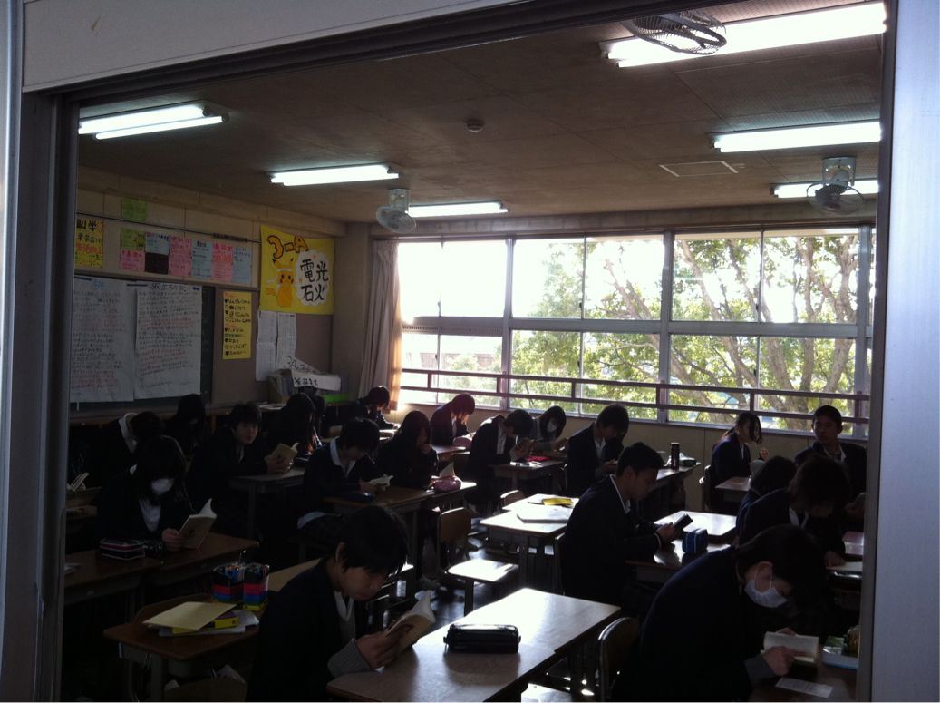 今朝の三年生学年集会は、前期選抜受検二日目のため、読書に変更しています。受検のため空席がありますが、みんな集中して読書に取り組んでいます。