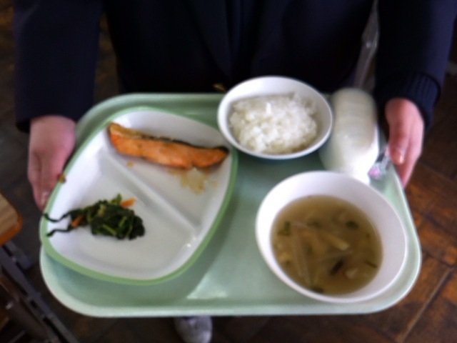 献立は、さけの照り焼きと小松菜の煮びたし。プルーン付きです。