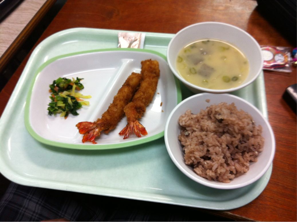 今日の献立は、お赤飯にエビフライです。三年生卒業お祝いバージョンです‼