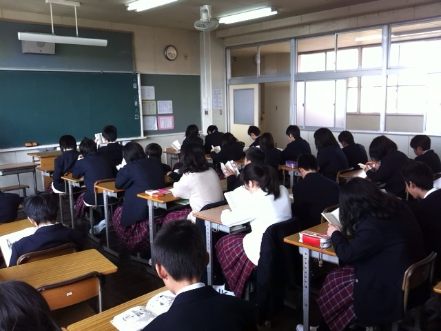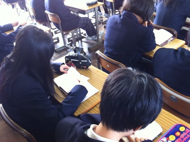 第三中では、集会の日をのぞいた朝、8時25分から15分間、読書をおこなっています。一年生は今日より朝読書に取り組みました。