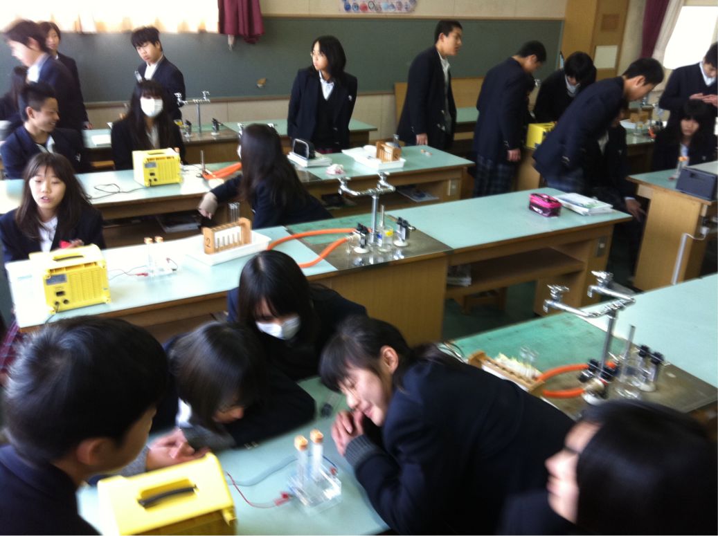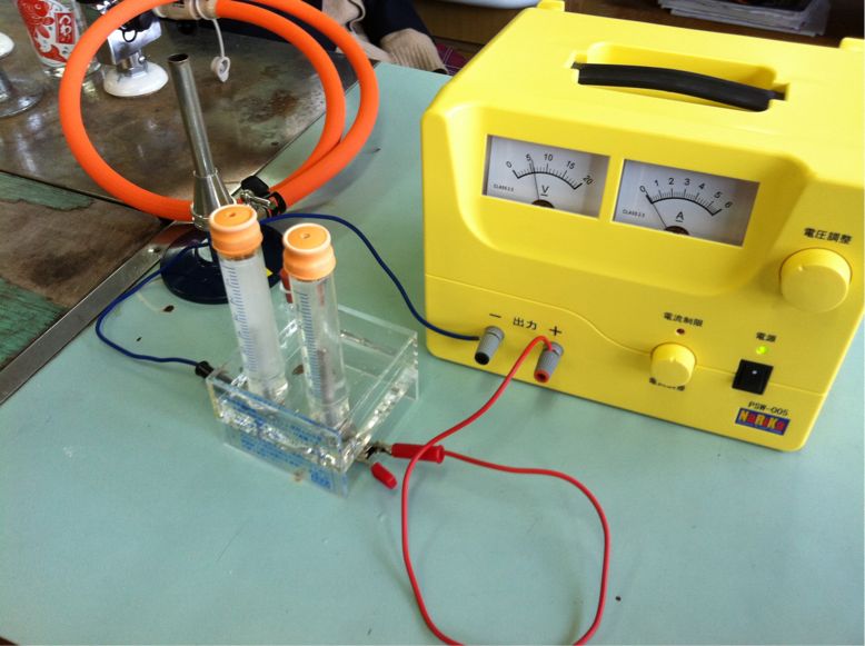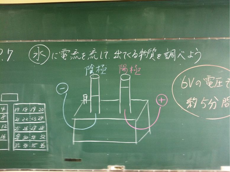二年生の理科では、水中に電気を流し、その時におきる現象について実験を交えて学習しています。