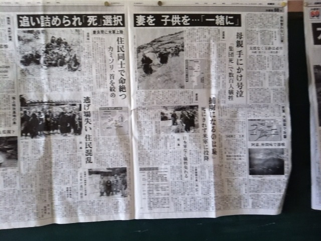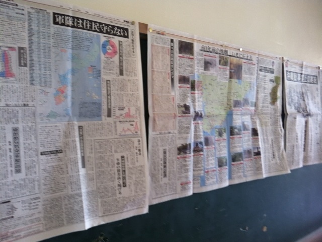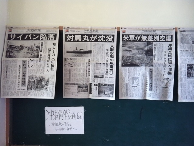 二階の渡り廊下の掲示物です。当時、国民に伝えられることがなかった沖縄戦の真実について、現在の視点で検証し、つくられた新聞です。