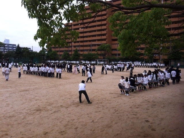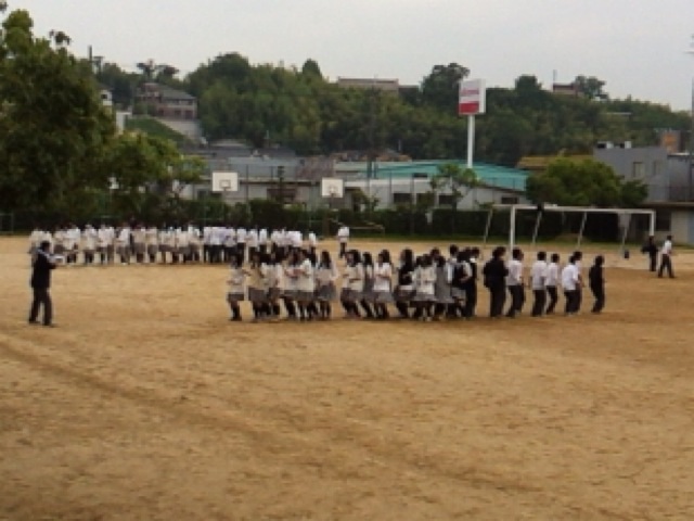 これは、体育大会の縦割りチームのつながりを意識したもので各カラーごとに集まり練習しています。
