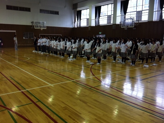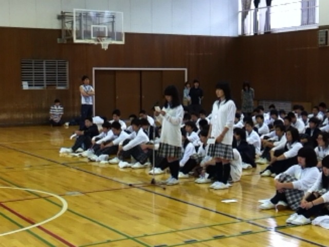 三年生は、この時間、来週の月曜日の全校集会でおこなわれる『平和の集い』のリハーサルをおこないました。