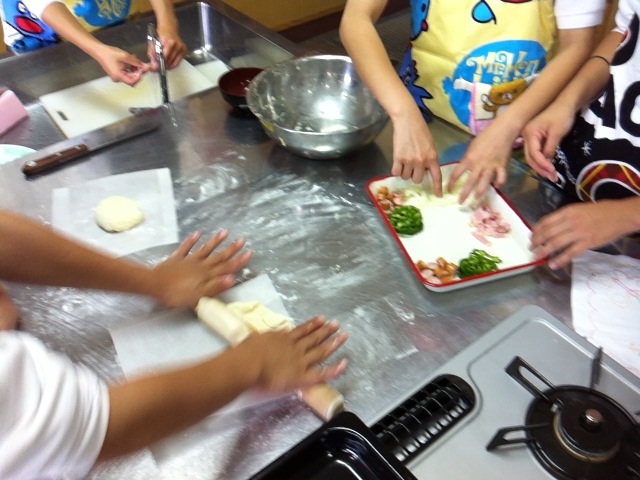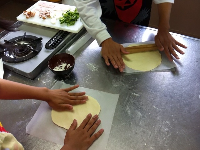家庭科室では2年生の調理実習でピザ作りを。音楽室では合唱『風になる』に取り組んでいました。