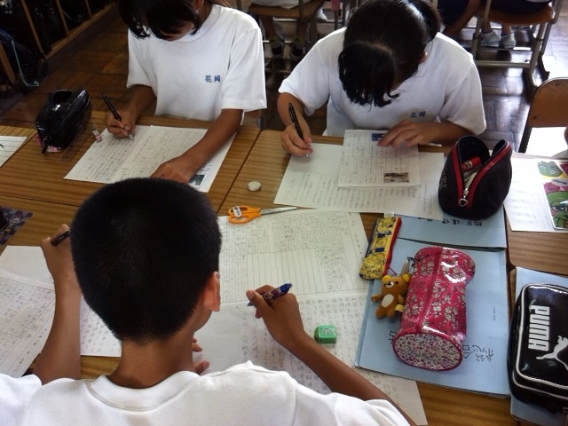 この時間、一年生では夏休みにおこなった各自の戦争に関する調べ学習の仕上げをしました。