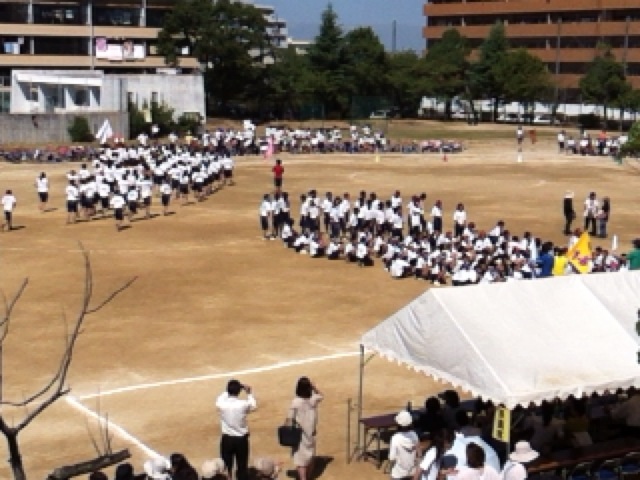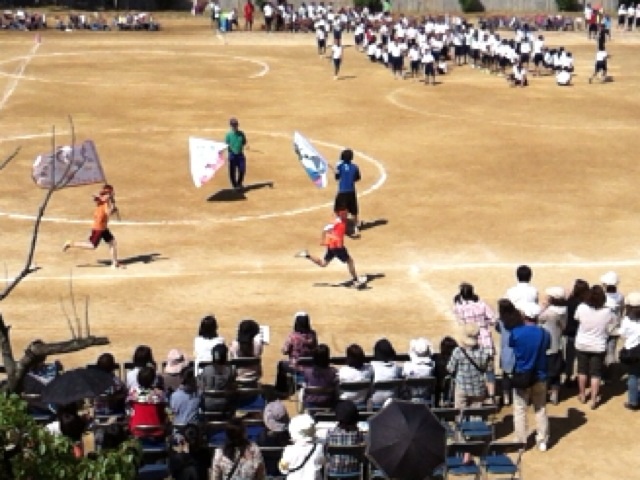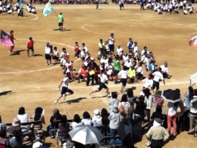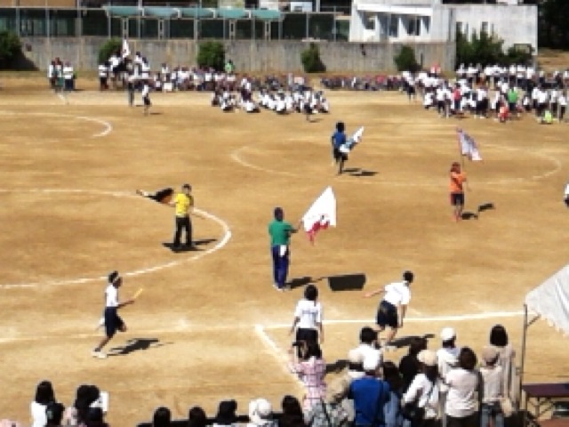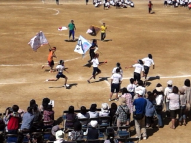 まずは一年生による全員リレーです。学級旗とともに入場です‼