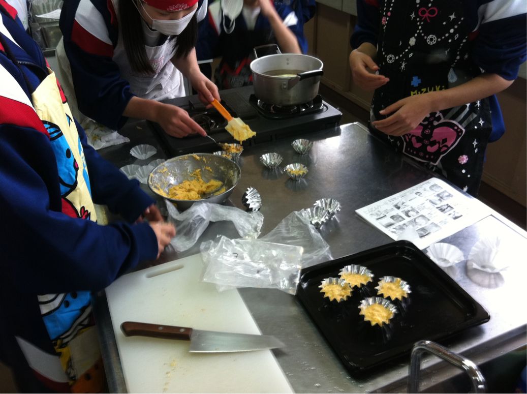 一年生の家庭科では、ニンジンのカップケーキを作りました。調理、片付けを班で協力しておこなえるように頑張っています。