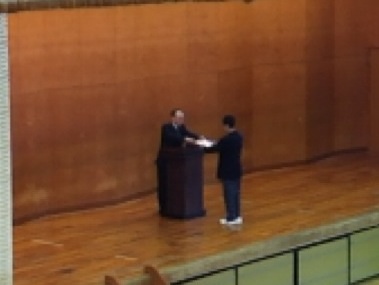 各学年の代表に一年間の学習を修了したとして通知表を校長より手渡しました。