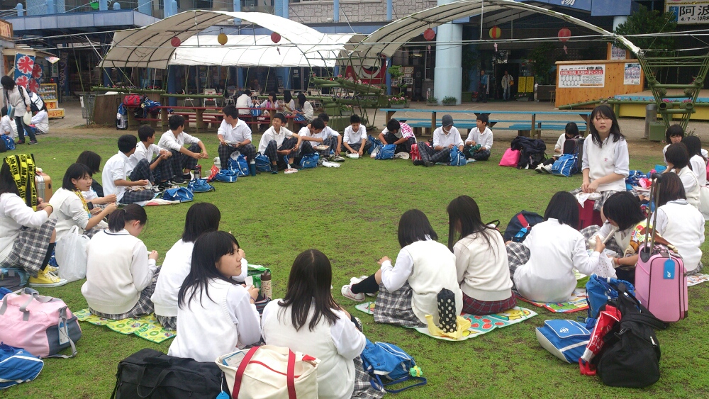 芝生広場でクラスごとにお弁当を食べています。