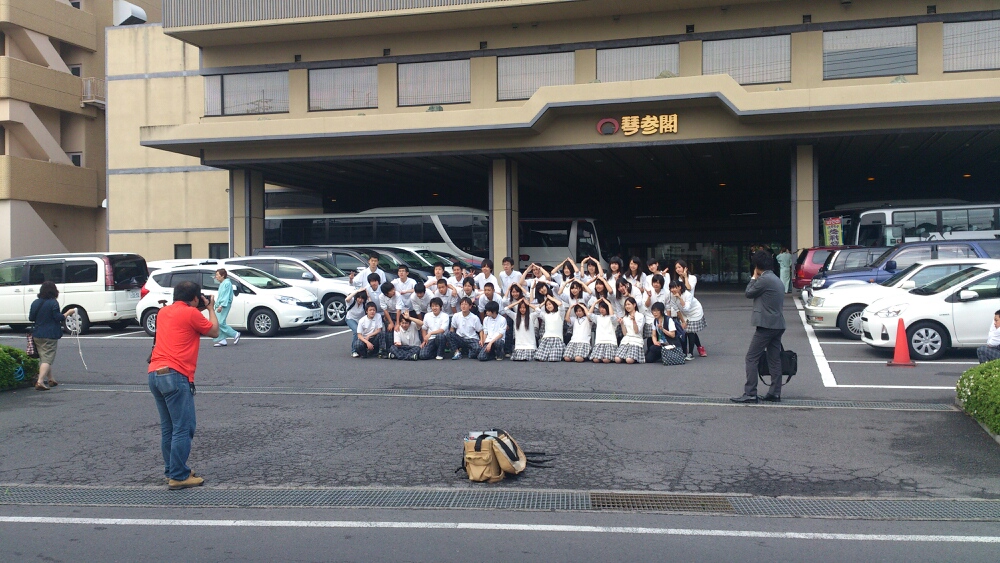 宿舎前でクラス写真を撮ったあと、琴参閣を出発しました。