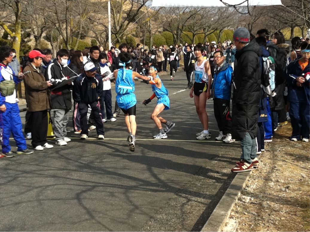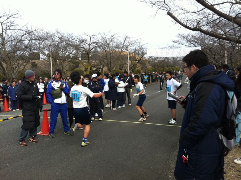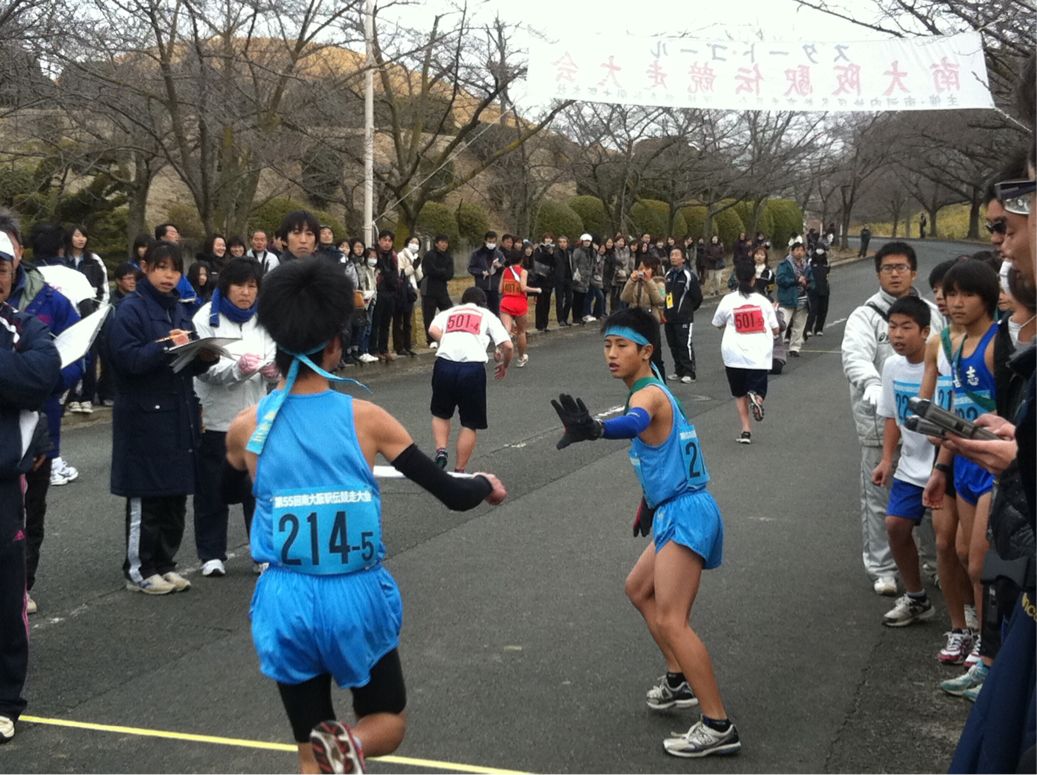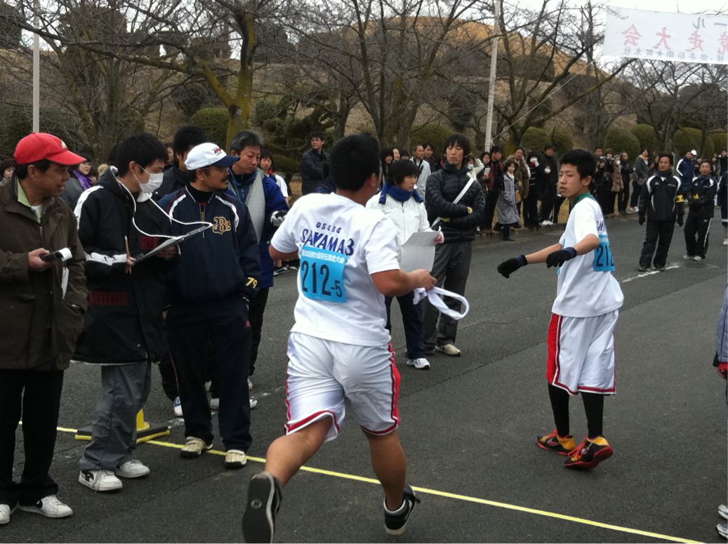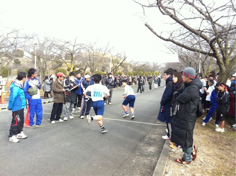 サッカー部、バスケットボール部3区から4区へタスキが渡りました。