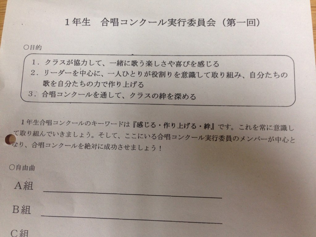 テスト終了後に合唱コンクールに向けて合同班長会議を開いています。