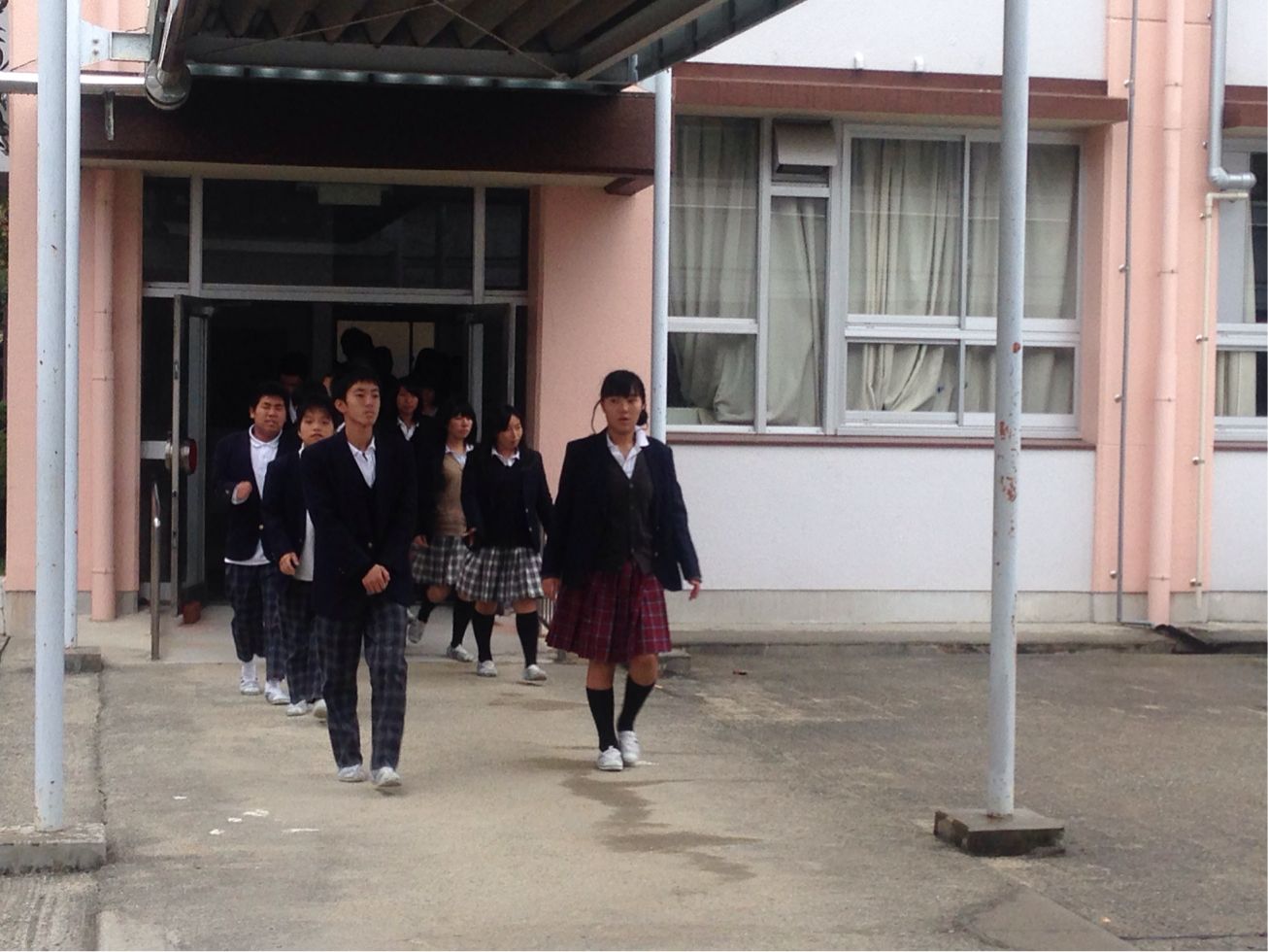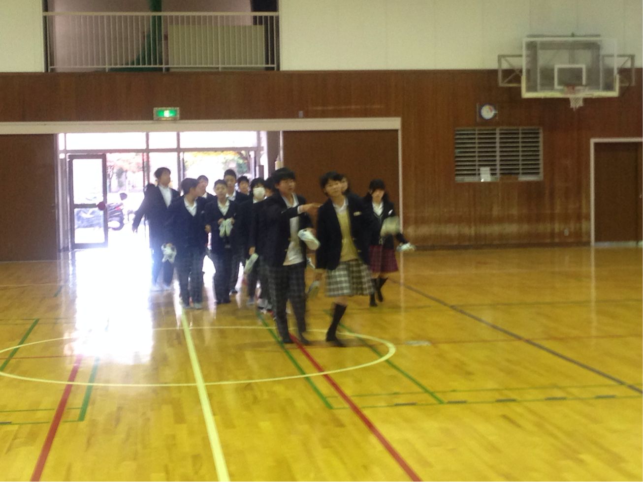 地震を想定した訓練です。雨が降っていたので、体育館に集まりました。