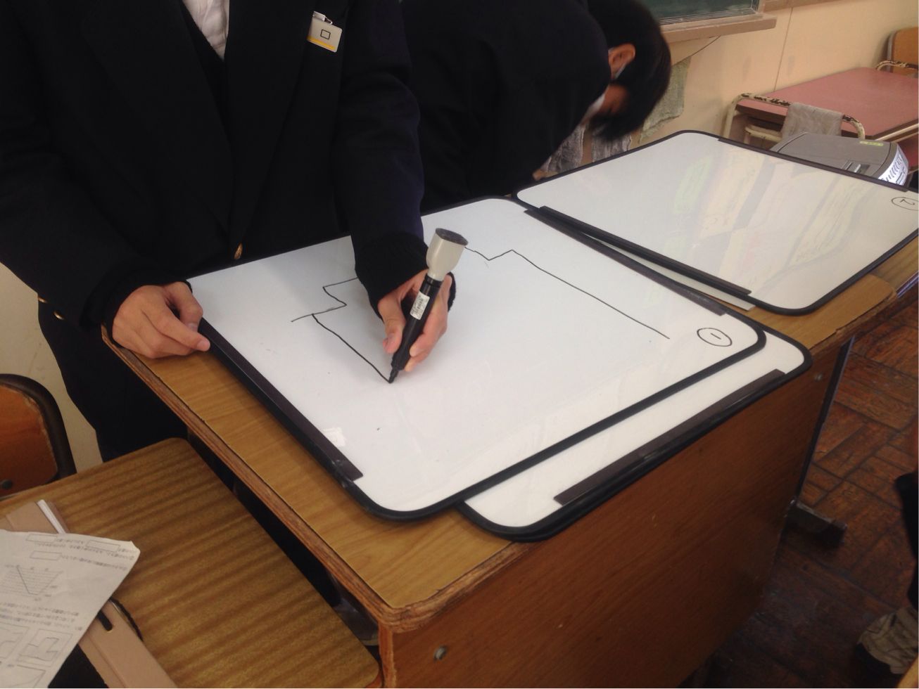 自分の考えをホワイトボードに書いています。