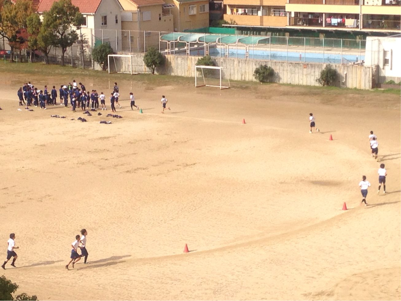 運動場では長距離走で体力向上です。