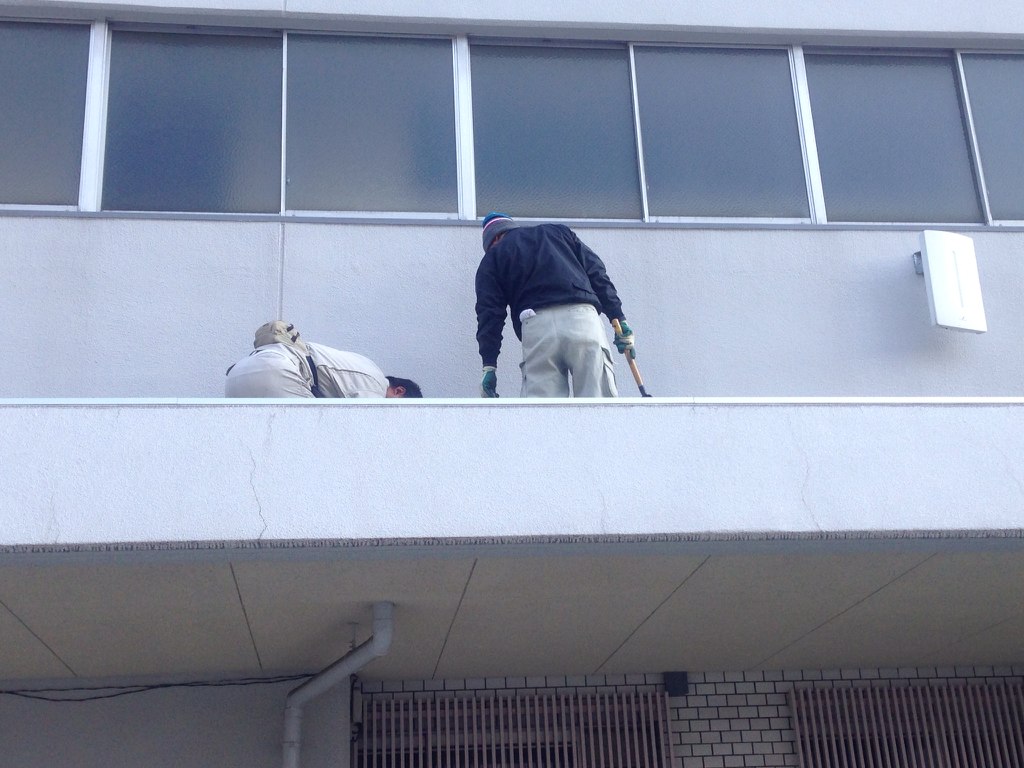テスト中、採点の合間に職員と教育委員会で屋上やひさしの清掃を行いました。