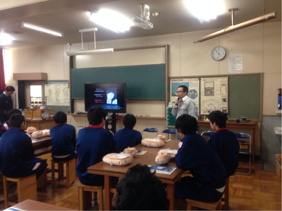 今日と明日の2日間、市役所の危機管理グループと消防本部、市民のかたに来ていただいて、AEDの使いかたなど救命救急について学んでいます。