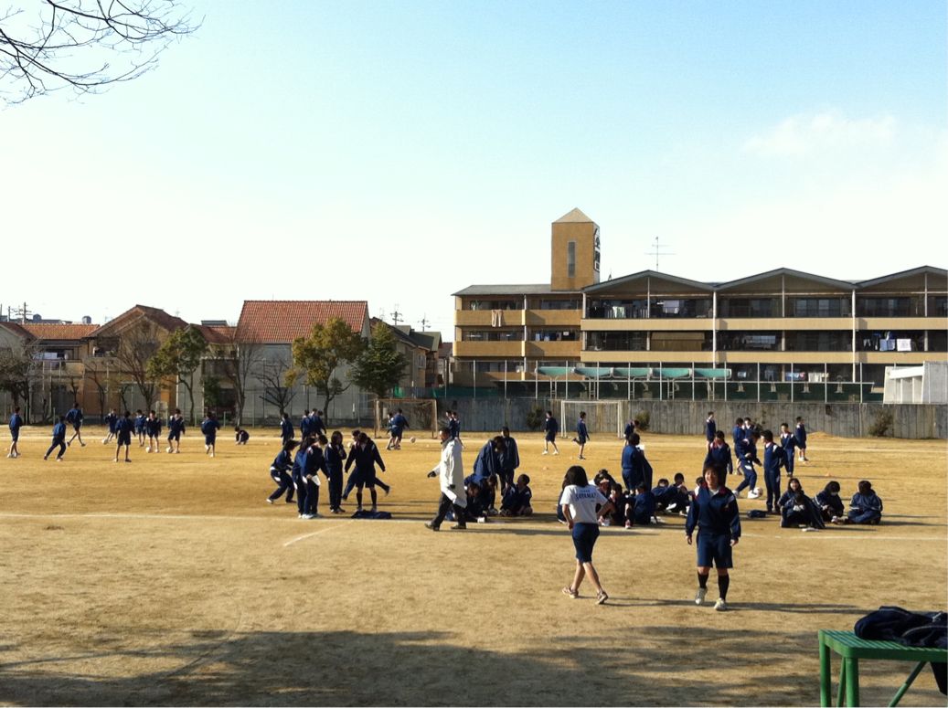 三年生の体育です。男子はサッカー。女子は持久走。寒さに負けず頑張っています。