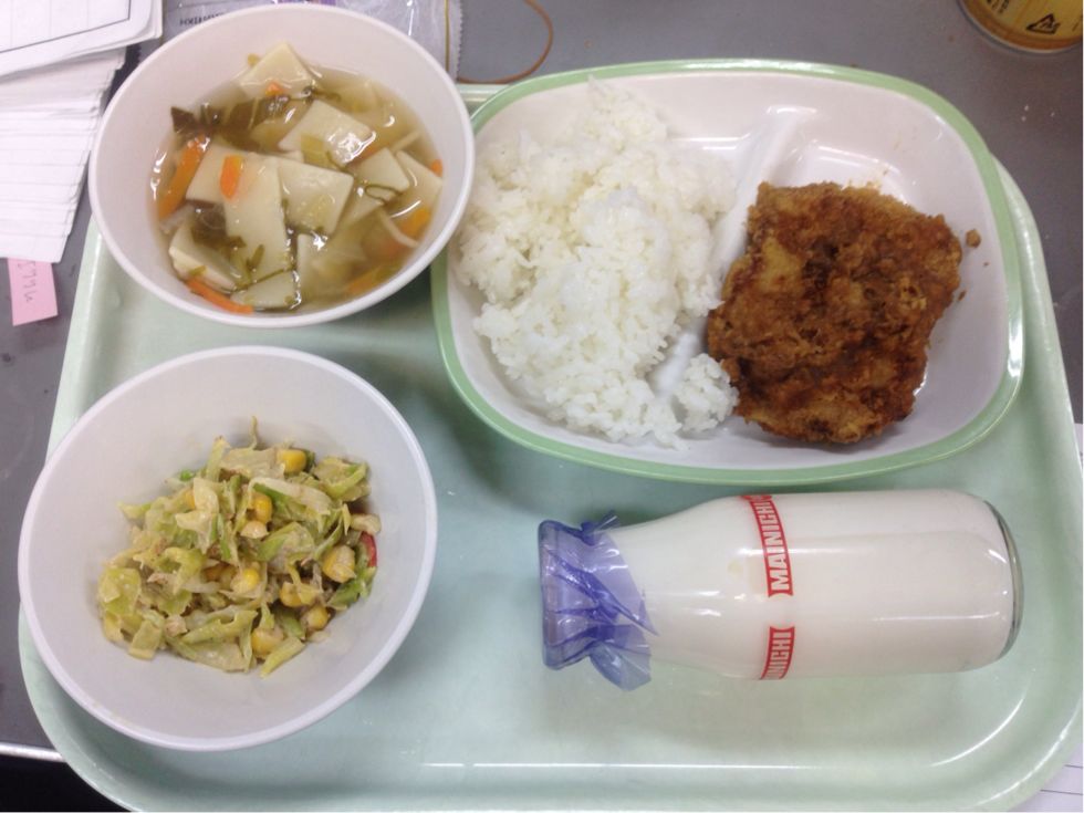 牛乳、ごはん、みそカツにごまだれキャベツとワンタンスープです。