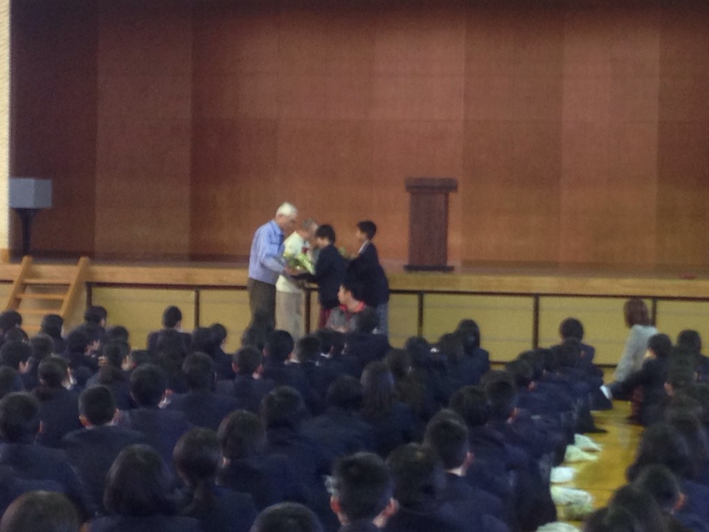 シルバー人材センターから環境整備に来ていただいているかたに感謝の気持ちを込めて生徒会から花束を渡しました。