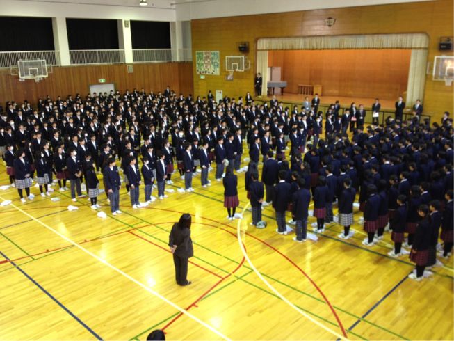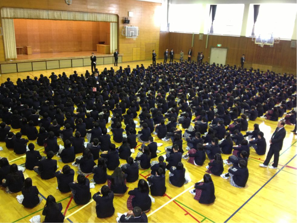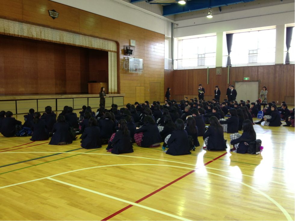 体育館へ移動し、2.3年生と1年生の対面式、赴任式、次いで始業式がとり行われました。