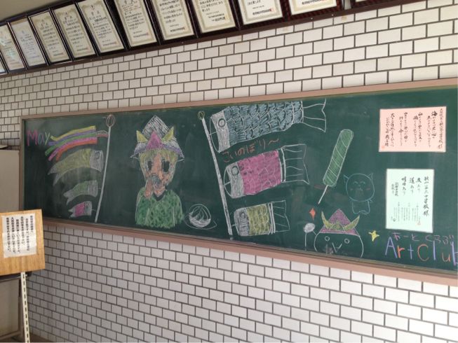 また、下足室横の黒板には美術部が季節にちなんだ絵を描いて、学校生活に花を添えています。