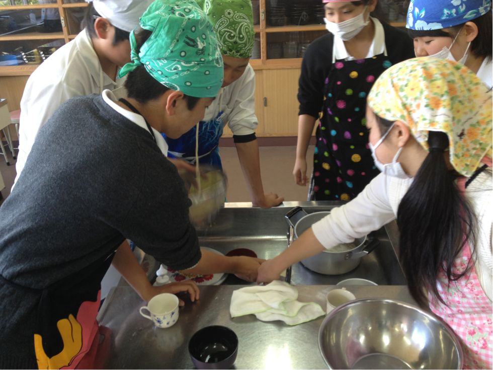 家庭科の授業では、昆布と鰹から出汁をとり、うどんを調理しました。