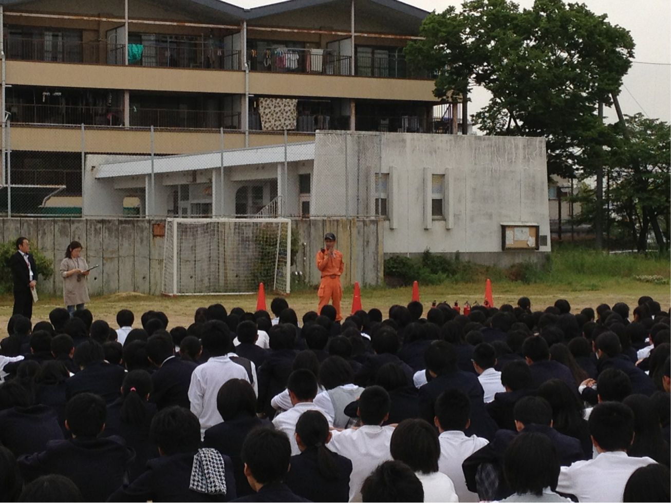 運動場に避難した後、消防本部の方から、災害時の心構えや初期消火の方法について話がありました。