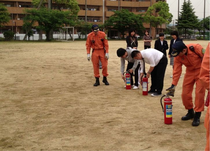 最後には、保健安全委員および教員が消火器を使用した初期消火の訓練を行いました。